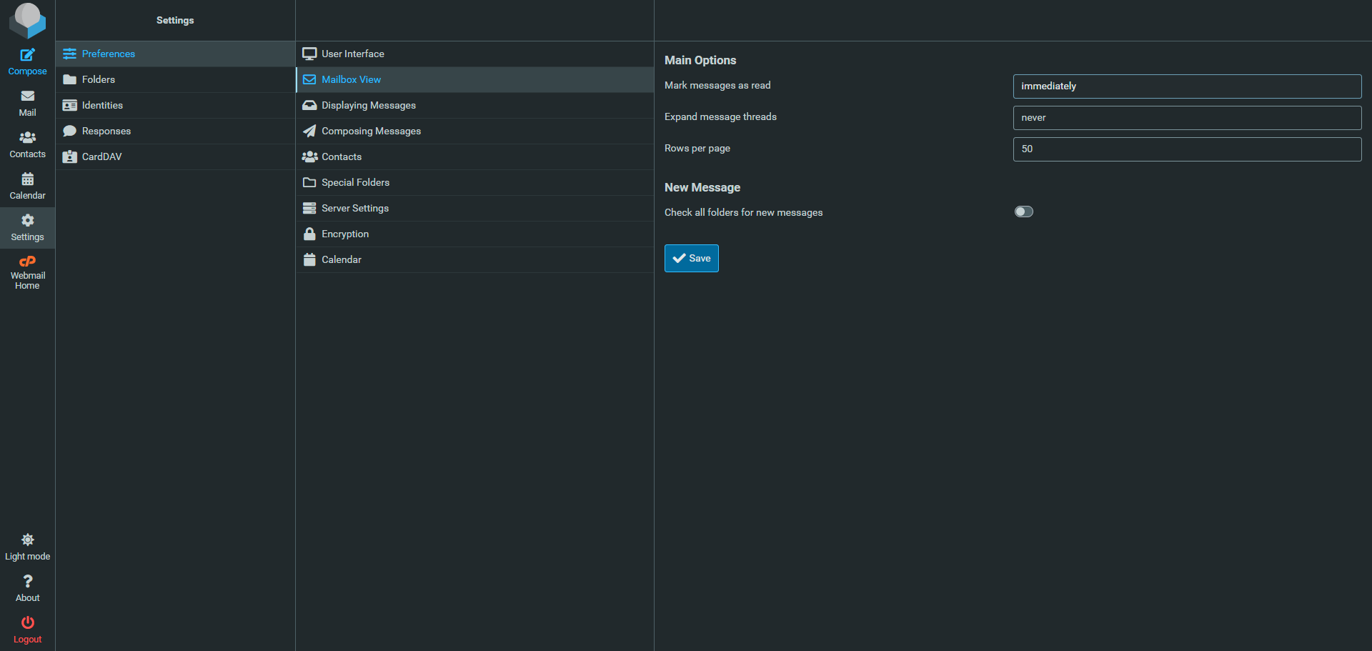 Here you can change how your mailboxes are displayed, adjust message reading options, and set the number of rows shown per page.