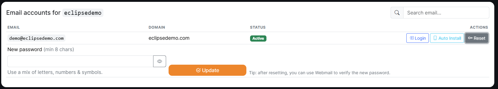 Once selected, the page will reload and display all email addresses for that domain. To change a password, simply click “Reset” next to the email address you want to update. A new box will appear below—enter your new chosen password and then click “Update” to save the change.