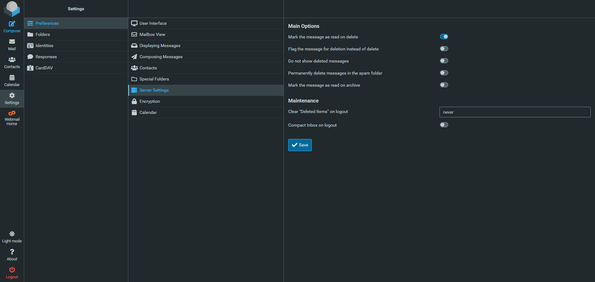 These settings control how deleted items are managed. To automatically clear your Trash and compact your Inbox when you log out, simply tick the two Maintenance options. This helps you stay on top of your mailbox storage capacity.